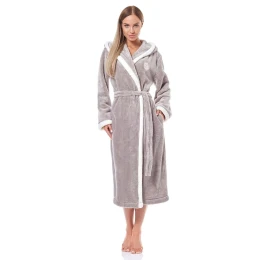 Dámský župan 9133 beige L&L - béžová barva - z měkkého materiálu typu soft - na bocích kapsy - zdobené nášivkou na přední straně - zavazování v pase na pásek - kontrastní lemování - s kapucí - krátký