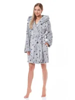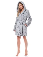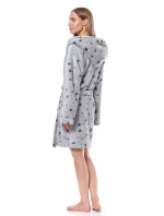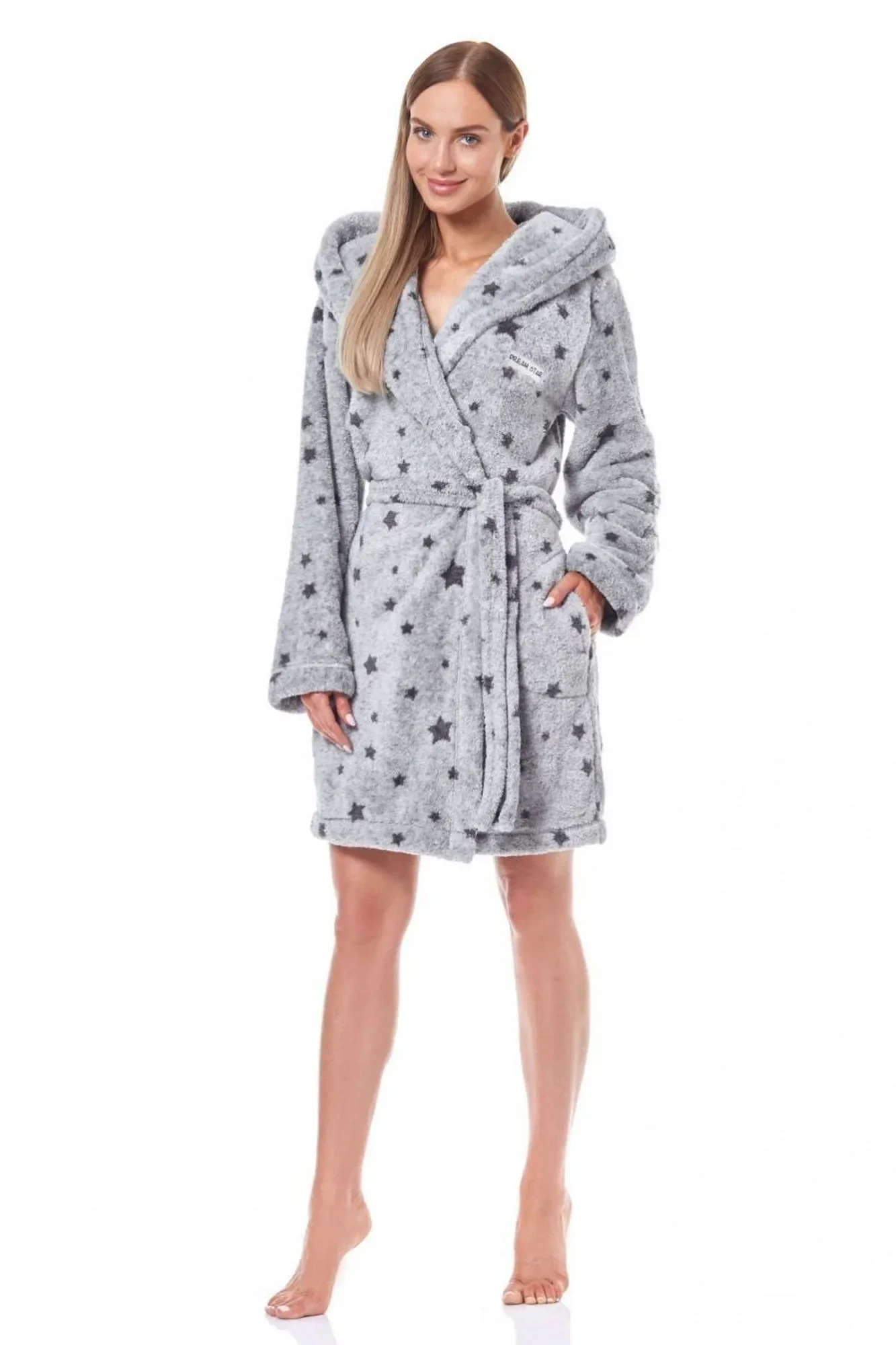 Dámský krátký župan 9135 L&L - ušitý z měkkého materiálu typu soft - šedá barva s grafitovými hvězdičkami - má kapsy a v pase vázání - s kapucí