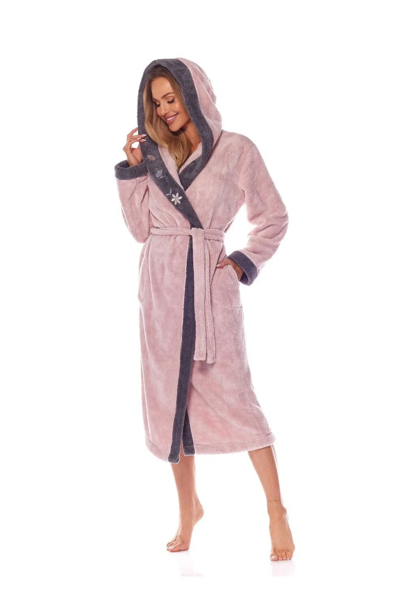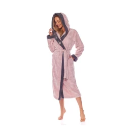 Dámský župan 9145 beige L&L - béžová barva - ušitý z měkkého materiálu typu soft - má kapsy a v pase vázání na pásek - kontrastní lemování - na lemování jsou ozdobné nášivky - s kapucí