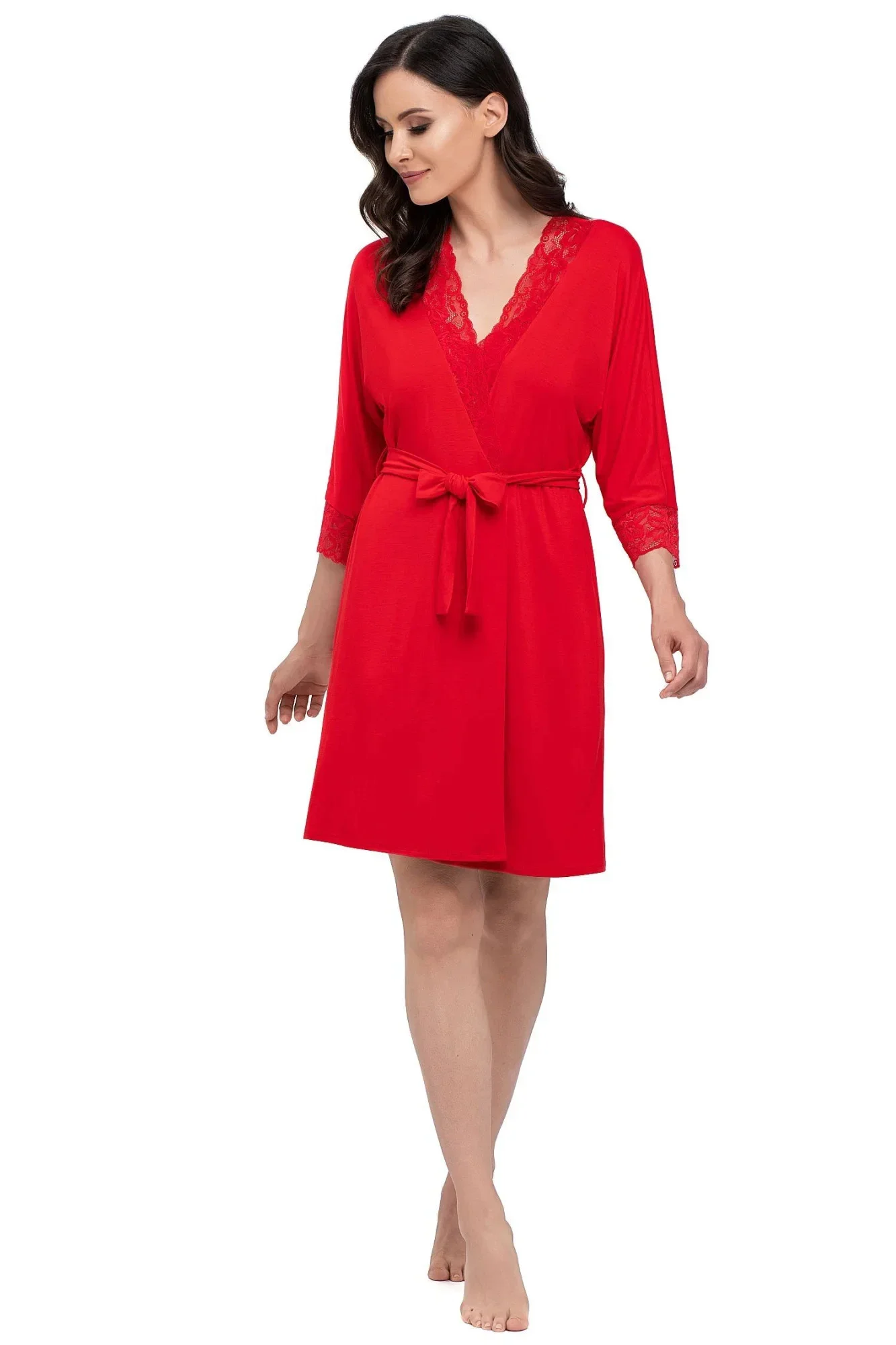 Dámský županArlena Babella - vyrobená z kvalitní a příjemné viskózy - červená barva - krátké kimonové rukávy - výstřih a lemy rukávů jsou ozdobené krajkovou výšivkou - pohodlný a komfortní střih na zavazování páskem - délka nad kolena