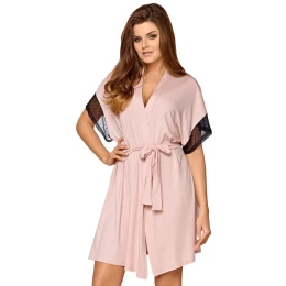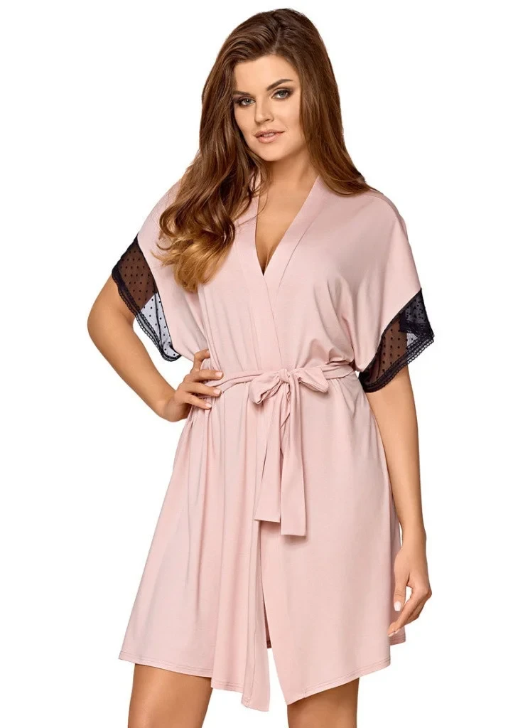 Lehký dámský župánek od oblíbené značky Babella v pudrové bavě je vyrobený z příjemného lehkého materiálu, má krátký rukáv s transparentní černou aplikací, v pase je pásek na stahování a délka do půl stehen.