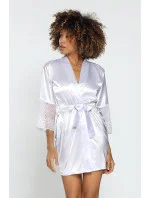 Elegantní župan ze saténu, bílý, v barvě perel, zavazuje se v pase. Střih s módními 3/4 dlouhými rukávy, na zápěstí zdobený květinovou krajkou. Ideální jako dárek pro milovanou osobu. 100% polyester.