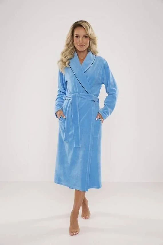 Dlouhý, pohodlný dámský župan s šálovým límcem. Ušitý je z příjemného veluru. Má kapsy a v pase je na zavázání. Obšitý kontrastními lemy.