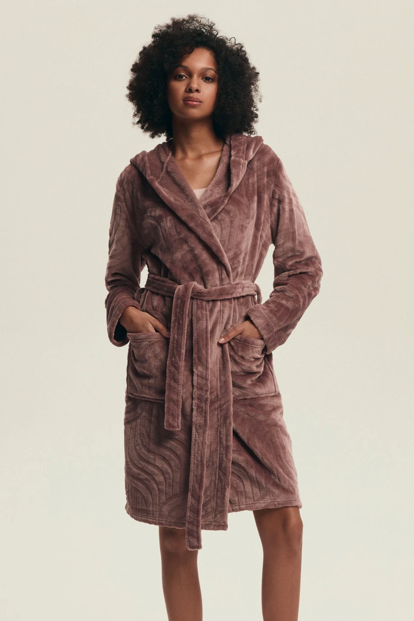 Szlafrok damski DEVYN 43602 AW25 to doskonała propozycja dla kobiet ceniących wygodę, elegancję i nowoczesne wzornictwo. Wykonany z wyjątkowo miękkiego materiału o geometrycznym tłoczeniu, zapewnia przyjemne ciepło i stylowy wygląd. Wyposażony w duży kaptur, pojemne kieszenie i pasek do przewiązania w talii, łączy w sobie funkcjonalność z subtelną kobiecością. Dostępny w modnych, pudrowych odcieniach, będzie idealnym towarzyszem poranków, wieczorów i chwil relaksu w domowym zaciszu.