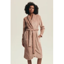 Szlafrok damski DEXTRA 43595 AW25 to perfekcyjne połączenie wygody i subtelnej elegancji. Wykonany z niezwykle miękkiego materiału, otula ciało przyjemnym ciepłem, zapewniając komfort zarówno rano, jak i wieczorem. Klasyczny krój z kopertowym przodem, wiązaniem w talii i praktycznymi kieszeniami doskonale dopasowuje się do sylwetki. Brak kaptura nadaje mu minimalistyczny, ale wciąż stylowy wygląd, który sprawdzi się jako codzienny domowy strój lub luksusowy element garderoby po kąpieli. Dostępny w dwóch naturalnych, modnych odcieniach.