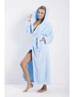 Dámský župan Diana long light blue DKAREN - světle modrá barva - z velice příjemného materiálu s dlouhým chlupem - má funkční kapuci, která sahá do půli zad - zavazuje se na huňatý pásek držící na poutkách - po stranách má všity dvě středně velké kapsy - příjemný a jemný na dotek - hřejivý a rychleschnoucí