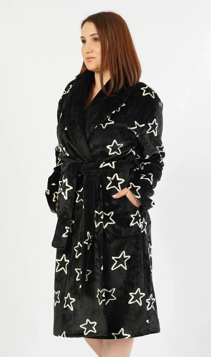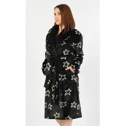 Dámský župan dlouhý Stars. Hřejivý dámský župánek ve tmavé barvě je potištěn obrysy hvězd. Župan má šálový límec, pásek ke stažení a praktické kapsy. Použitý softový materiál je jemný a poddajný na dotek.