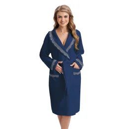 Elegantní dámský velurový župan. Límec i kapsy jsou obšité krajkou. V pase na zavázání.