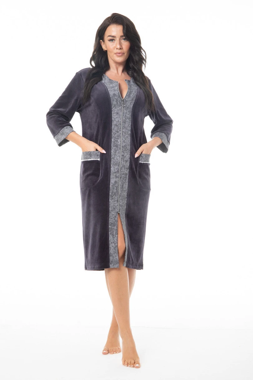 Dámský župan FR-404 značky Dorota je kombinací stylu, pohodlí a funkčnosti, vytvořenou pro ženy, které si v domácnosti cení pohodlí a elegance. Je vyroben z bavlny příjemné na dotek s příměsí polyesteru, což zajišťuje náležitou vzdušnost a měkkost, ideální pro chladná rána a večery. Zip zajišťuje rychlé a pohodlné oblékání, zatímco 3/4 rukávy a délka pod kolena předurčují model k celoročnímu nošení. Další výhodou jsou praktické kapsy na úrovni boků. FR-404 je nepostradatelným kouskem domácího šatníku, který kombinuje pohodlí s ženským střihem.