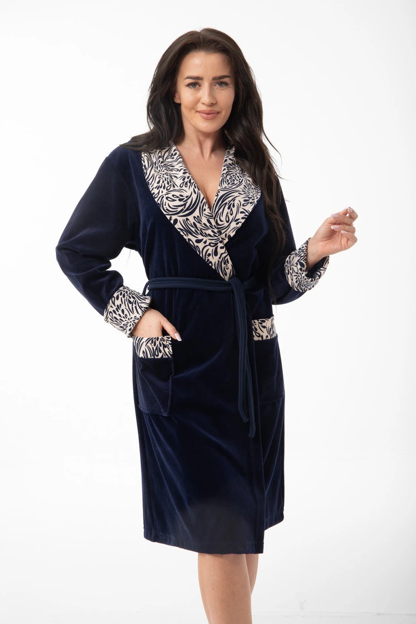 Praktické kapsy na úrovni boků zvyšují komfort používání a umožňují uložení drobných předmětů. Límec a rukávy zakončené kontrastní látkou dodávají modelu moderní a stylový vzhled. Župan FR-413 Dorota je vynikající volbou pro ženy, které oceňují pohodlí, kvalitu a elegantní styl v domácím provedení.