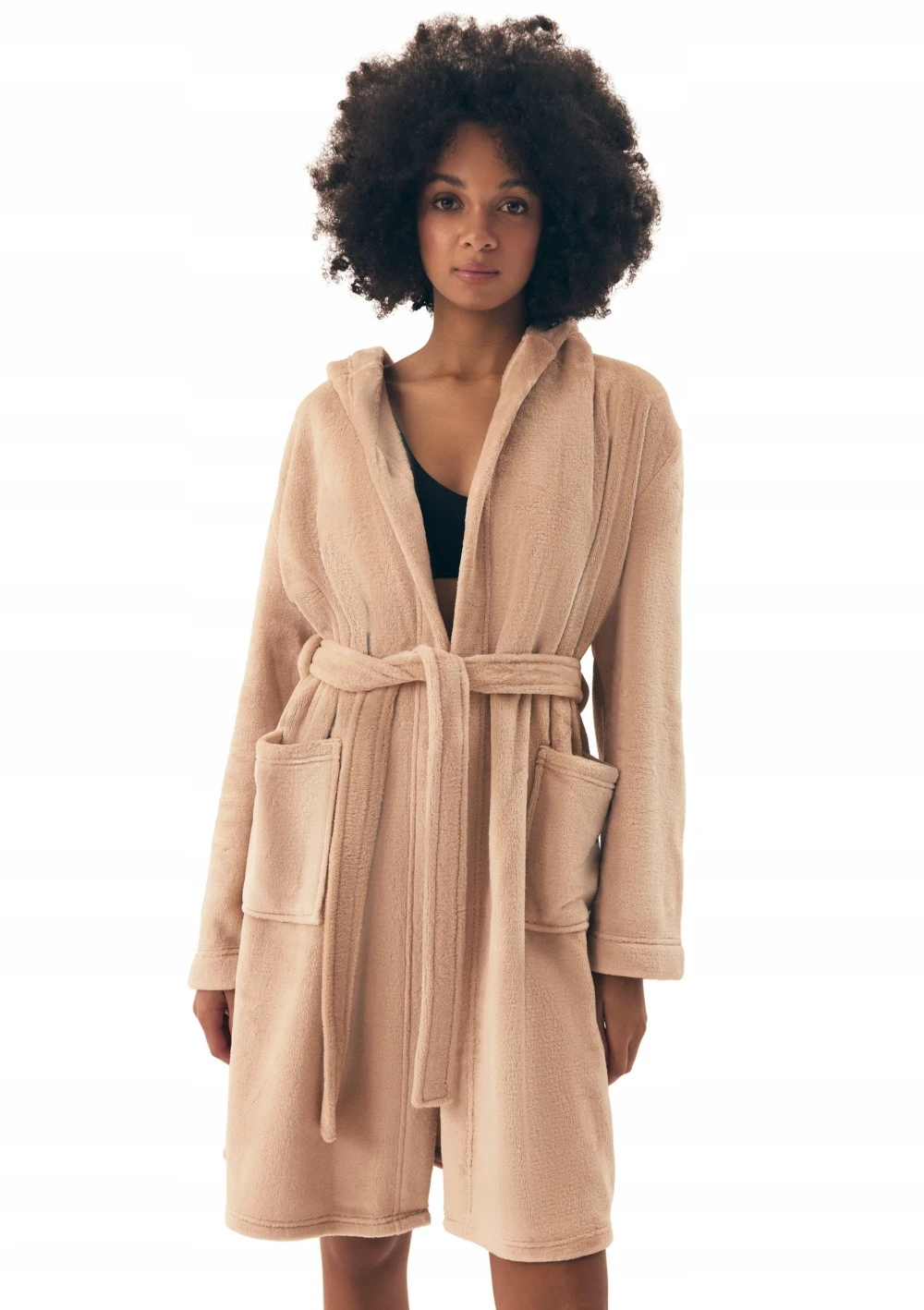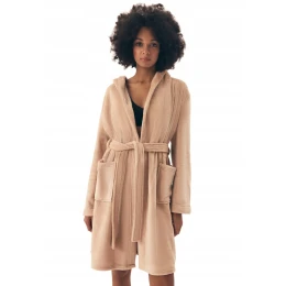 Dámský župan s kapucí značky Henderson. Župan je dlouhý nad kolena. Na stranách jsou našité kapsy. Župan lze okolo pasu uvázat páskem, který drží na přišitých poutkách. Župan je velmi příjemný na dotek.