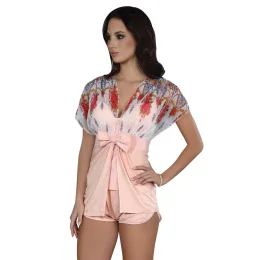 Dámský župan Imperia Livco - z pestrobarevného hladkého příjemného materiálu na dotek - horní část z mačkaného tylu květinové vzoru - ozdobený velkou růžovou mašlí - dvě očka na zapínání - krátké rukávy