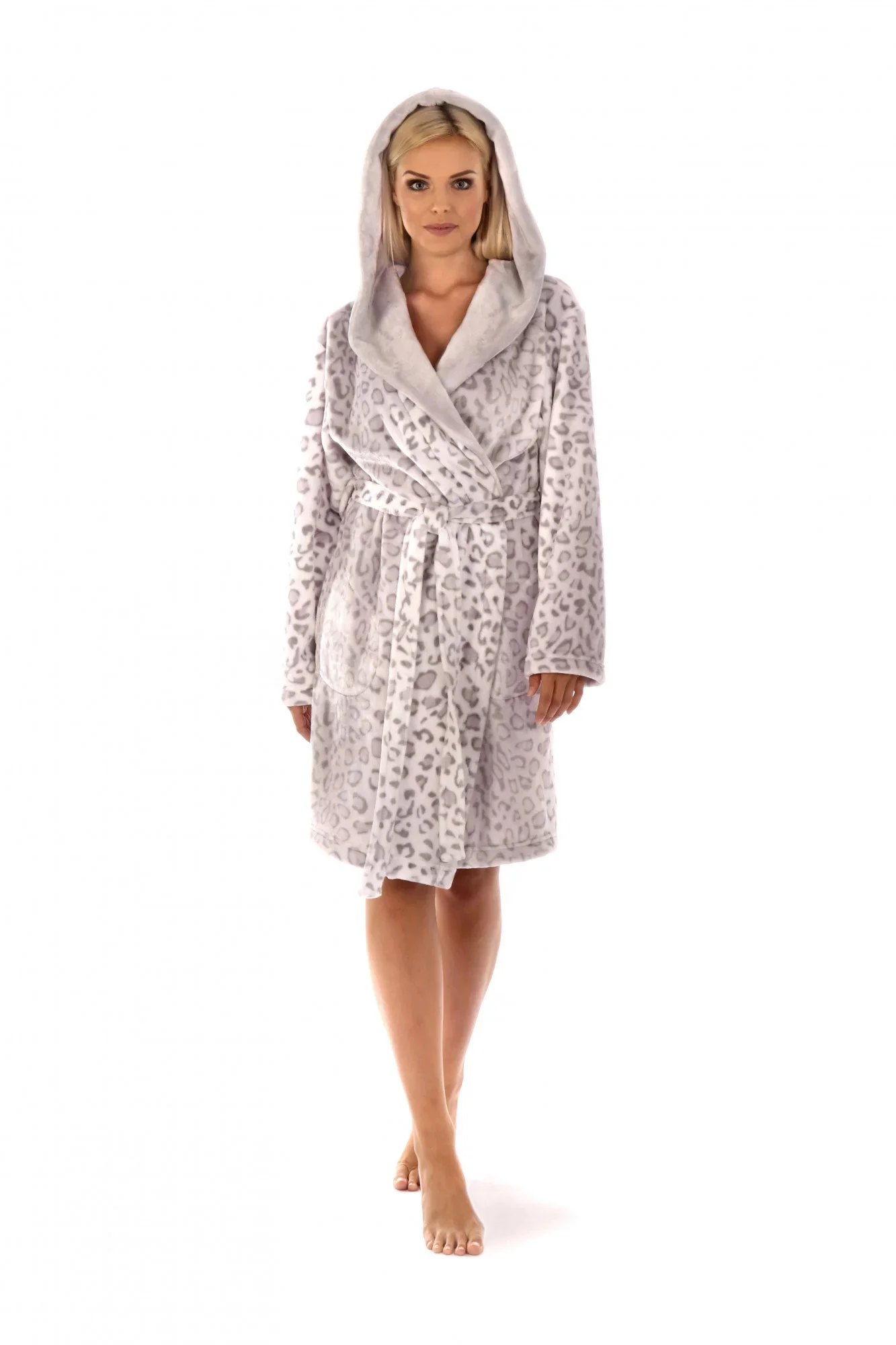 Dámský župan se nabízí ve světle šedém základu s leopardím límcem nebo obrácená varianta s šedým límcem na leopardím základu.