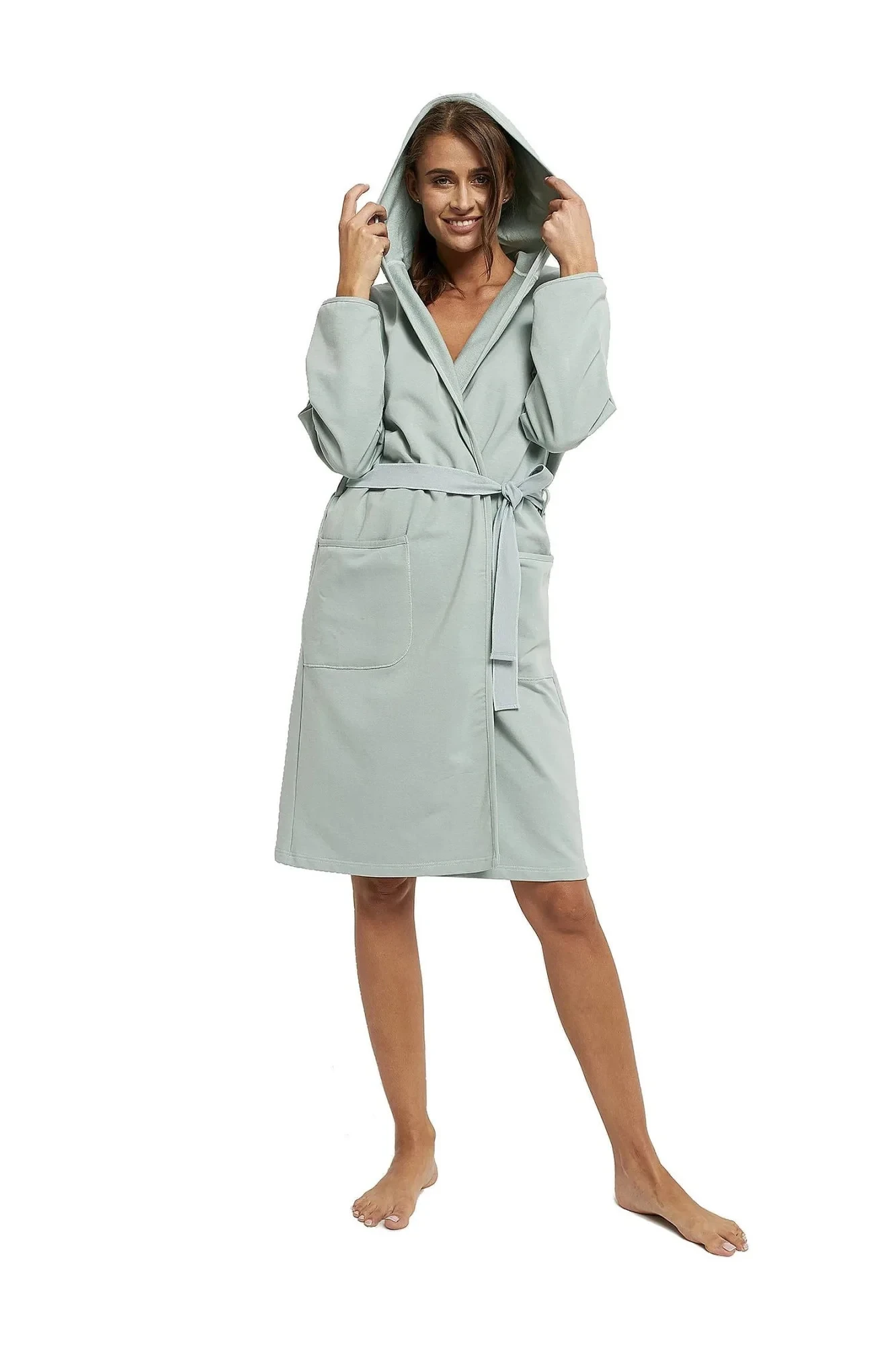 Dámský župan Karina mint ITALIAN FASHION - mátová barva - je vyrobený z velmi kvalitní teplákové bavlny - s dlouhými rukávy - zavazování na pásek v pase - na bocích jsou kapsy - s kapucí - délka nad kolena