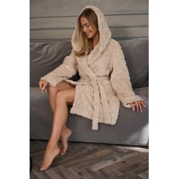 Dámský župan L&L 2553 je kombinací funkčnosti, pohodlí a romantického stylu. Je vyroben z měkkého, nadýchaného úpletu ze 100% polyesteru, příjemně obepíná tělo a poskytuje tepelný komfort. Materiál zdobí jemný vypouklý vzor ve tvaru srdce, který mu dodává jemný a ženský charakter. Model má praktickou kapuci, která chrání před chladem, dlouhé rukávy a dvě vnější kapsy umístěné na úrovni boků. Zavazování v pase umožňuje přizpůsobit župan vaší postavě a zvýraznit pas. Díky krátké délce je lehký a pohodlný, ideální na ráno, večer nebo po koupeli.