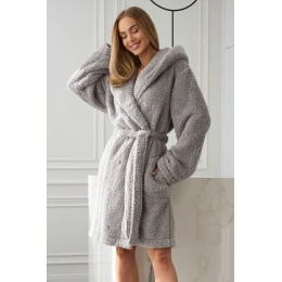 Szlafrok Damski Krótki 2559 to połączenie komfortu, ciepła i kobiecego stylu. Wykonany z wyjątkowo miękkiej, puszystej dzianiny, otula ciało delikatnością i zapewnia przyjemne ciepło po kąpieli lub podczas leniwych poranków. Posiada kaptur, który dodaje uroku i praktyczności, oraz wiązanie w pasie, pozwalające dopasować krój do sylwetki. Kieszenie umieszczone po bokach zwiększają wygodę użytkowania. Szlafrok sięga przed kolano, co nadaje mu lekkości i nowoczesnego wyglądu. Idealny na chłodne dni i wieczory.