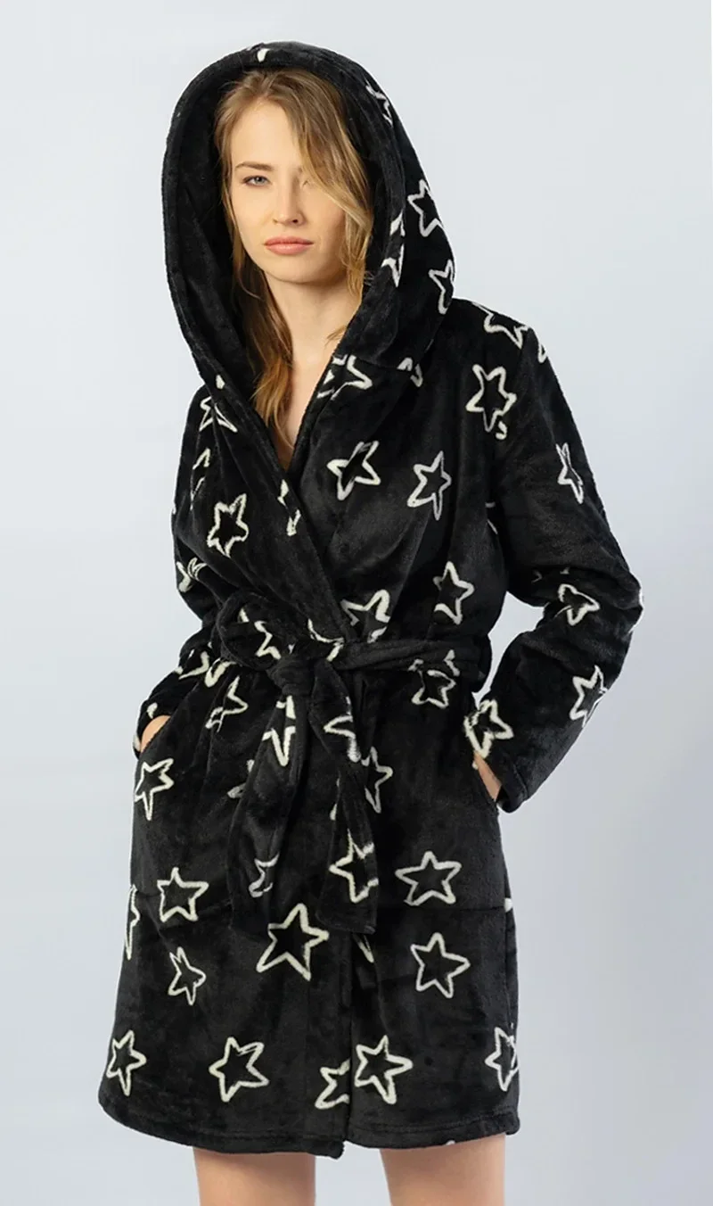 Dámský krátký softový župan s kapucí Hvězdy. Hřejivý dámský župánek ve tmavé barvě je potištěn obrysy hvězd. Župan má kapuci, pásek ke stažení a praktické kapsy. Použitý softový materiál je jemný a poddajný na dotek.