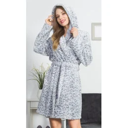Dámský krátký softový župan s kapucí Leopard grey. Dámský hřejivý župan s páskem a kapucí je potištěn imitací leopardí kůže v příjemné šedé barvě. Župánek Vás zahřeje po koupeli i na cestě do postele, a jistě oceníte také praktické kapsy. Použitý softový materiál je jemný a poddajný na dotek.