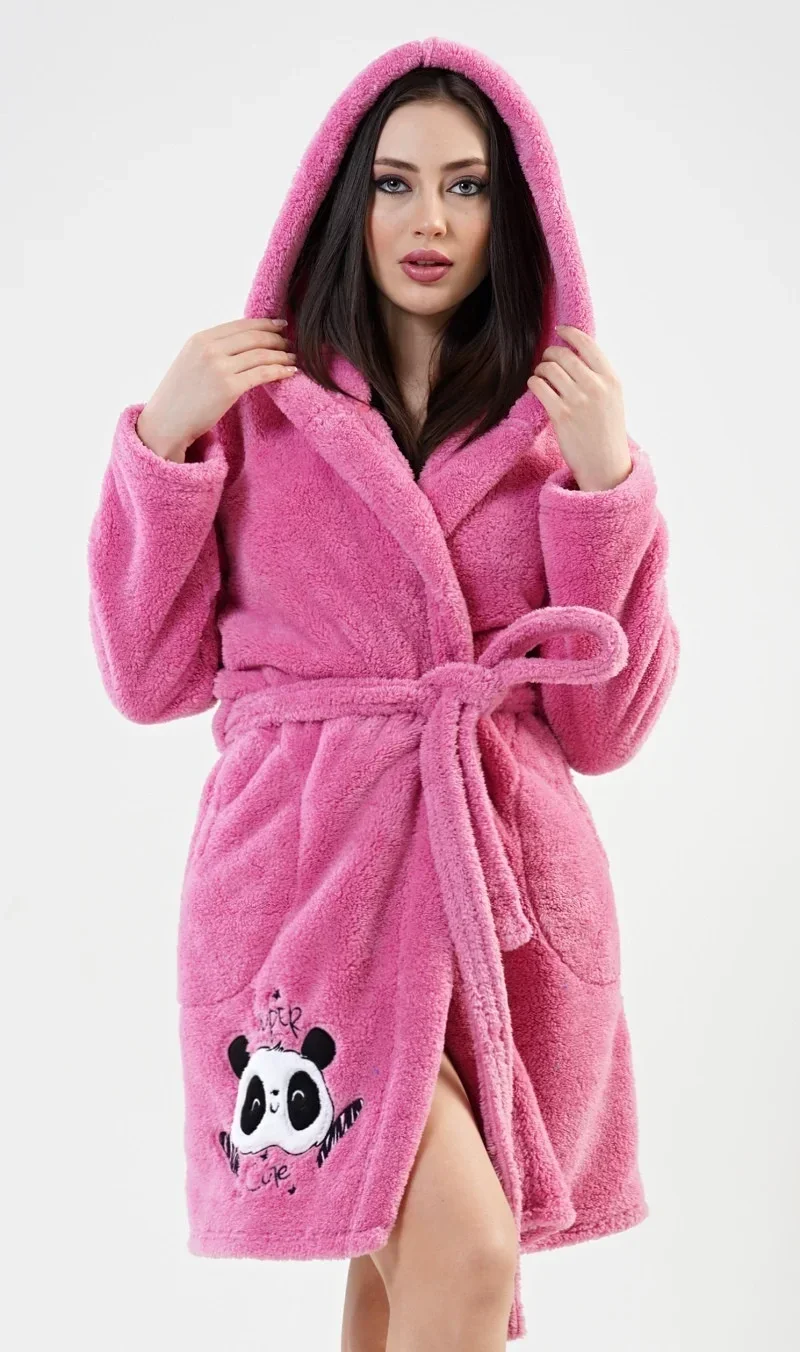 Dámský softový krátký župan s kapucí Panda. Dámský župan s kapucí, páskem k převázání a kapsami vás zahřeje při cestě do postele, i po koupeli. Na boku je obrázek roztomilé pandy. Použitý softový materiál je jemný a poddajný na dotek.