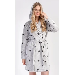 Dámský krátký softový župan s kapucí Puntík. Župan má kapuci, kapsy a pásek k převázání. Světle šedý podklad je zdobený tmavě šedými kuličkami. Použitý softový materiál je jemný a poddajný na dotek. Župan Vás zahřeje cestou z koupelny i při lenošení na gauči, bude to Váš milý společník v chladných dnech.