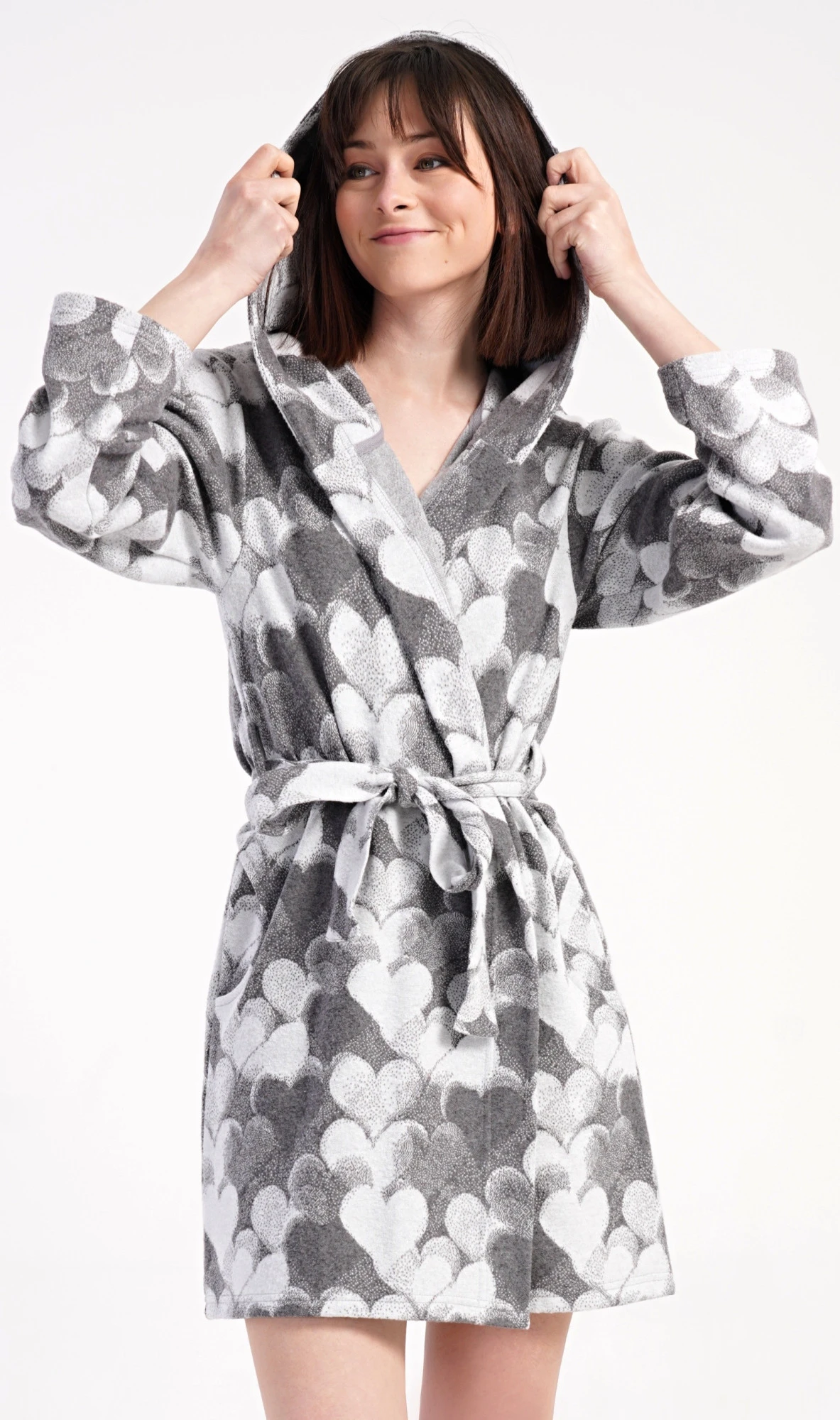 Dámský krátký župan s kapucí Srdce. Dámský župánek s délkou pod kolena je potišten srdíčky v šedých tónech. Župan má pásek ke stažení a praktické kapsy. Použitý materiál s obsahem bavlny 48% je příjemný a poddajný na dotek. Oceníte ho i po koupeli a při lenošení doma na gauči.