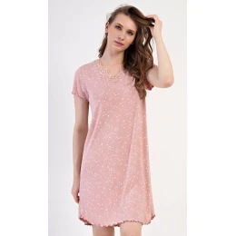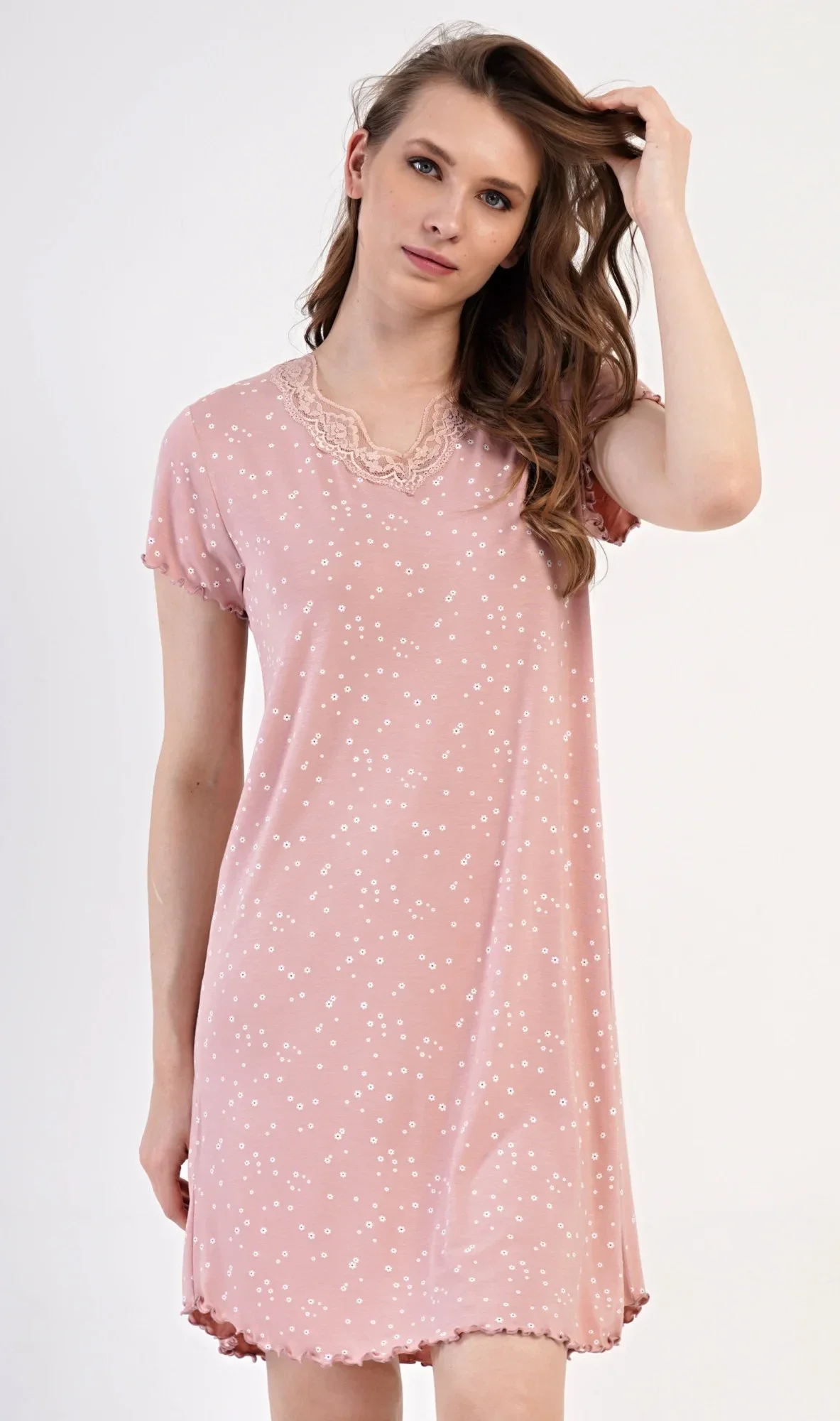 Dámská noční košile s krátkým rukávem Judita. Noční košile má příjemnou délkou nad kolena a ozdobné žlábkování okolo rukávů a spodního lemu. Výstřih je ozvláštněn jemnou krajkou. Košile s krátkým rukávem je potištěna drobnými kvítky. Použitý materiál ze směsi viskózy a lycry je příjemný a poddajný na dotek.