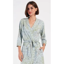 Dámský krátký bavlněný župan Sofie. Dámský župánek v délce po kolena je potišten listy v mentolové a šedé barvě. Župan má pásek ke stažení a praktické kapsy. Použitý bavlněný materiál je příjemný a poddajný na dotek, saje a oceníte ho i po koupeli.