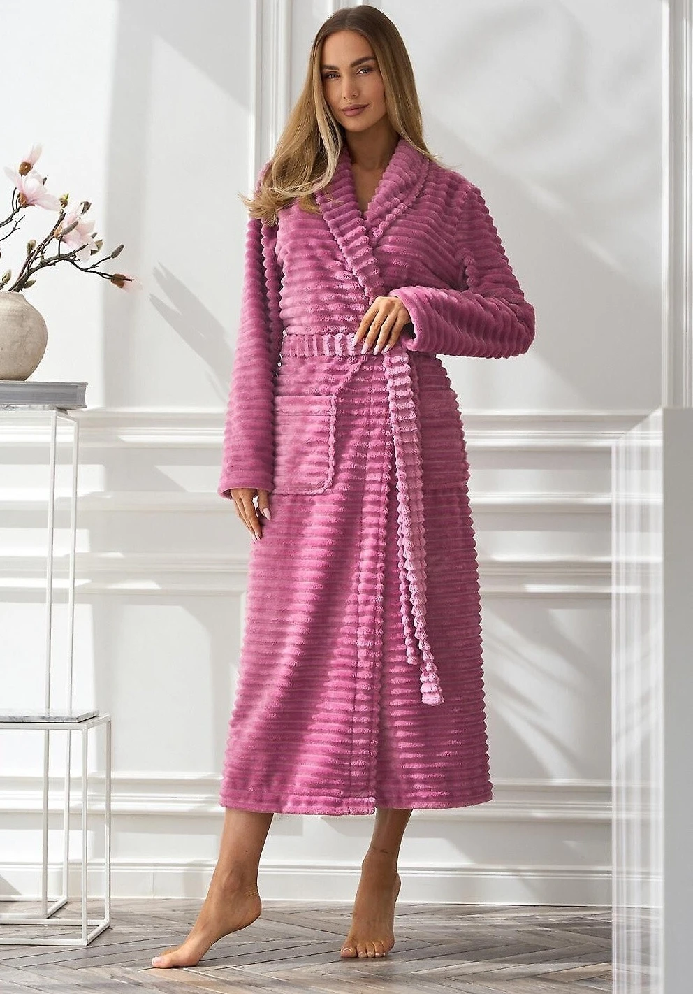 Dámský župan s vyráženým vzorem značky L&L. Župan je dlouhý pod kolena a na bocích má hluboké kapsy. Župan lze okolo pasu uvázat páskem. Župan je velmi příjemný na dotek.