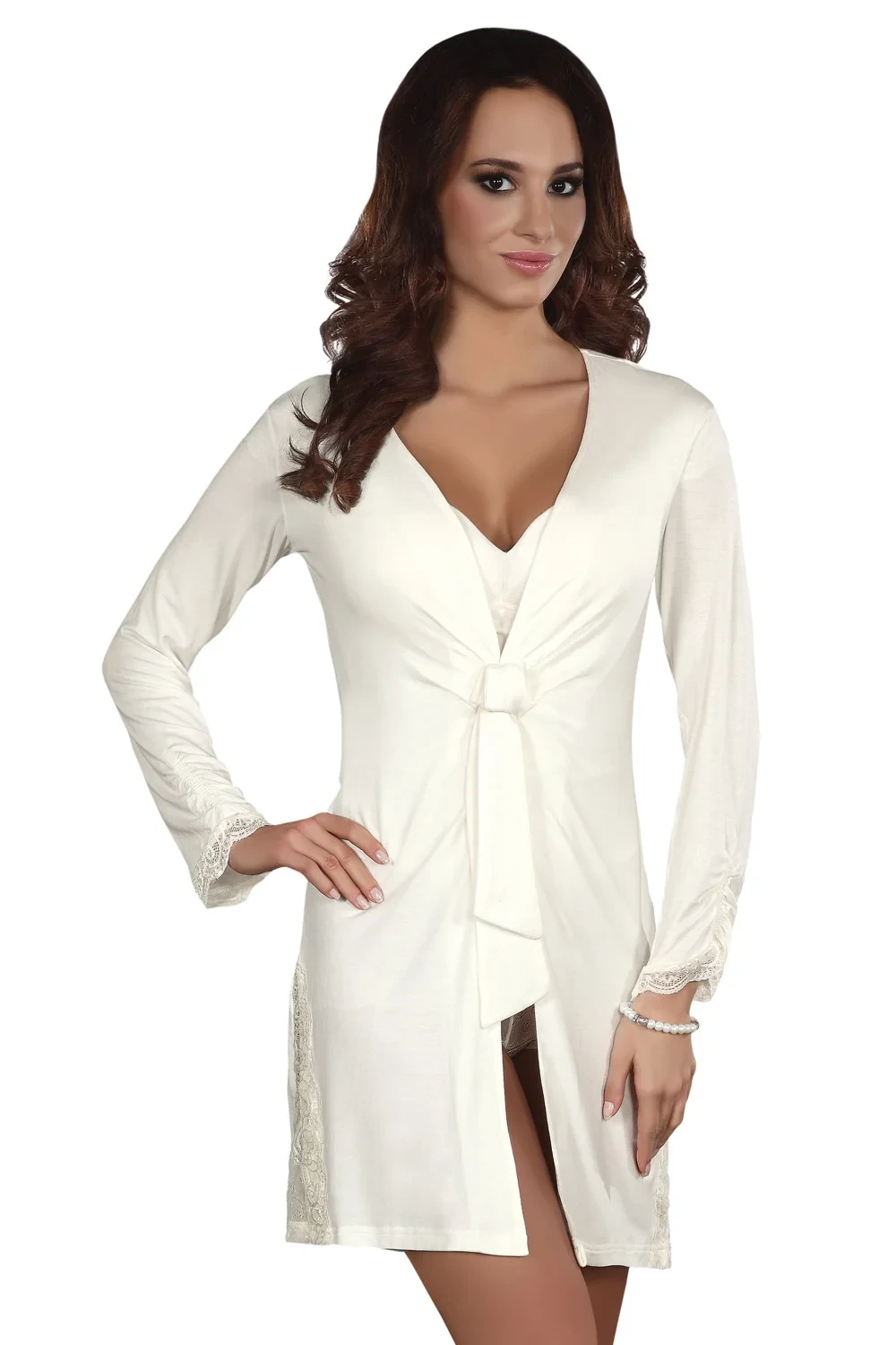 Dámský župan Lavinia Livco - z krémového příjemného materiálu na dotek - dlouhé rukávy zakončené luxusní krajkou - rozparky na bocích - zavazování na pásek v oblasti dekoltu - délka nad kolena