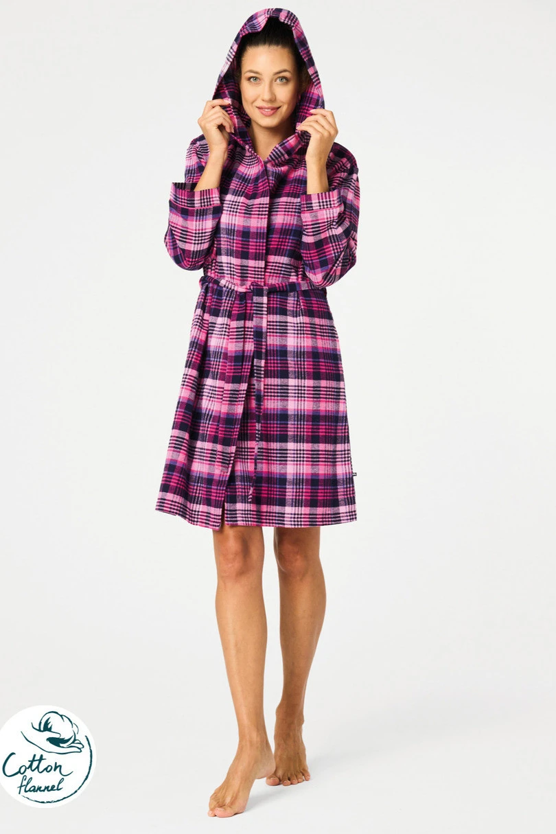 Szlafrok damski LGD 490 to połączenie ciepła, wygody i kobiecego stylu. Wykonany z wysokiej jakości bawełny flanelowej, jest wyjątkowo miękki i przyjemny w dotyku, a jednocześnie zapewnia doskonałą izolację cieplną w chłodniejsze dni. Klasyczny wzór w różowo-czarną kratę nadaje mu ponadczasowego uroku. Model posiada praktyczny kaptur chroniący przed chłodem, pasek do wiązania w talii oraz wygodne kieszenie, w których można ogrzać dłonie lub schować drobiazgi. Idealny do narzucenia po kąpieli, porannym prysznicu czy na relaksujący wieczór w domu.