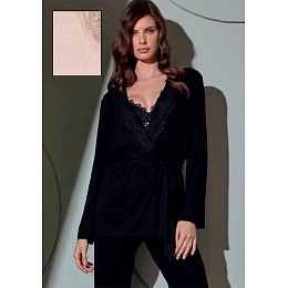 Dámský župan Lormar v jemné béžové barvě je ideální volbou pro chvíle odpočinku i stylové domácí nošení. Lehký a příjemný materiál se krásně přizpůsobí postavě a zajišťuje maximální pohodlí po celý den. Župan má klasický zavinovací střih s páskem na zavazování, který umožňuje individuální přizpůsobení siluety. Výstřih do V je zdoben jemnou krajkou, která dodává celému modelu ženský a sofistikovaný vzhled. Dlouhé rukávy a splývavý střih podtrhují eleganci a dělají z tohoto kousku perfektní doplněk k nočnímu prádlu i domácím outfitům.