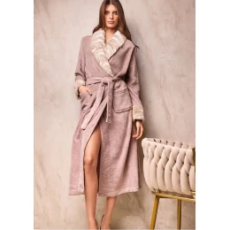 Mimořádně jemný a hřejivý dlouhý župan v romantickém odstínu světle hnědé, který okouzlí kombinací nadýchaného materiálu a elegantního vzhledu. Límec a manžety jsou lemované měkkou umělou kožešinkou pro ještě větší komfort. Model se zavazuje páskem v pase a je doplněn prostornými kapsami. Délka ke kotníkům zajišťuje dokonalé zahřátí i během nejchladnějších dnů.