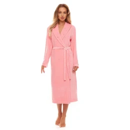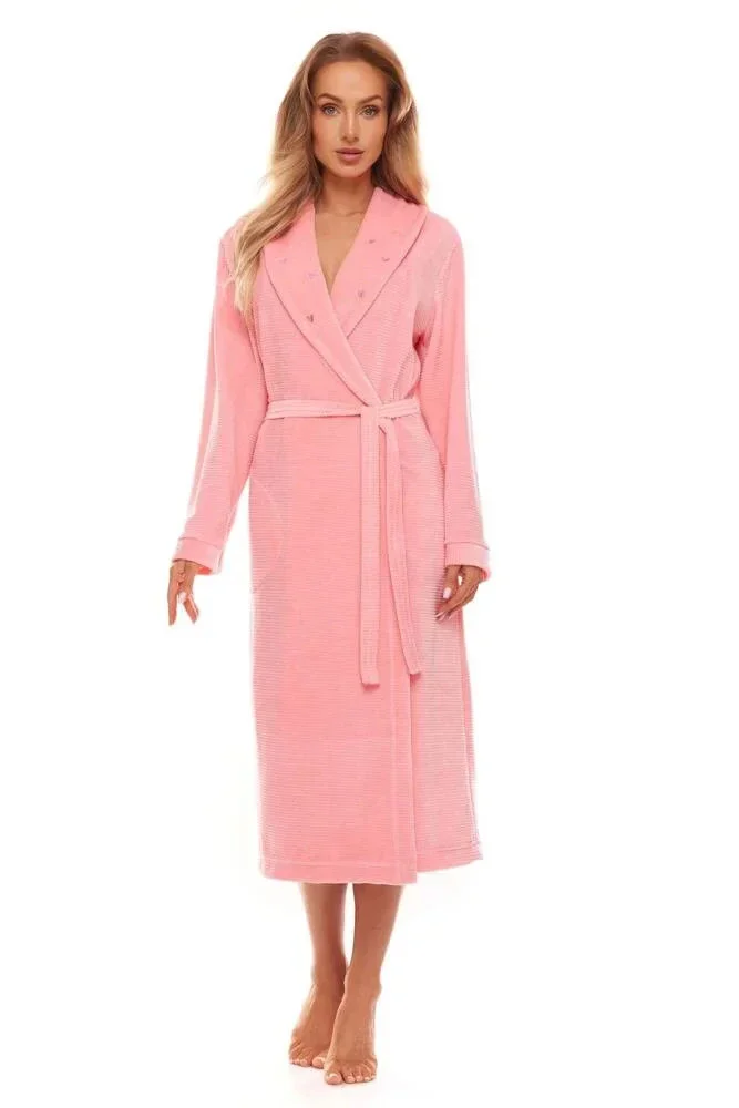 Dámský župan Nature je vyrobený z bavlny s příměsí, má originální proužky, výšivku a krásnou meruňkovou barvu.