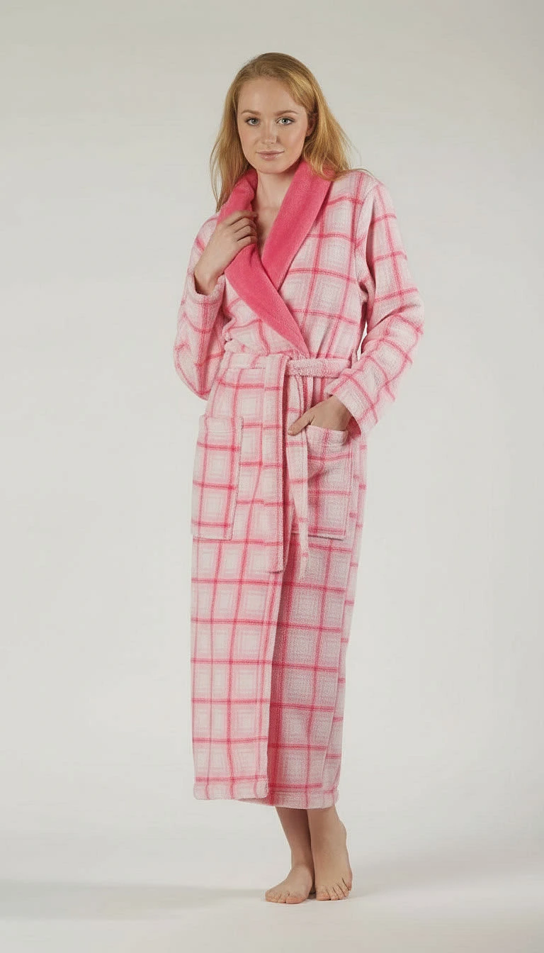 Střih se šálovým límcem je pohodlný a pásek na převázání pomůže přizpůsobit velikost vaší postavě. Vzor růžovo-bílé kostky působí jemně a svěže, jednobarevný růžový límec celý vzhled elegantně sjednocuje.