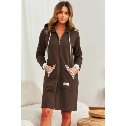 Szlafrok damski SMZ.4508 BIG J/25 marki Dr Nap to nowoczesna propozycja w sportowym stylu, która z powodzeniem zastąpi klasyczną bluzę. Wykonany z miękkiej i przyjemnej w dotyku dzianiny, zapewnia komfort przez cały dzień – nie tylko rano czy wieczorem. Model zapinany na suwak nie tylko wygląda stylowo, ale jest też bardzo praktyczny w codziennym użytkowaniu. Ozdobne ściągacze przy rękawach i kieszeniach nadają całości sportowego charakteru, a wygodny fason sprawia, że czujesz się swobodnie – nawet w towarzystwie.