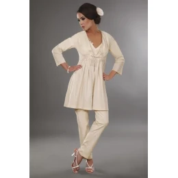 Pohodlný bavlněný župan světlé barvy s výšivkou v oblasti prsou. Univerzální, ideální pro každé roční období, měkký a elegantní, střih a'la kimono, volný a splývavý lem, rukávy ve 3/4 délce, zavazování vpředu. 95 % bavlna, 5 % elastan.