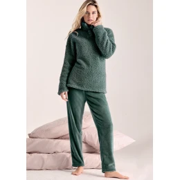 Dámské domácí pyžamo Infiore z mimořádně hřejivého a měkkého „teddy“ materiálu, který poskytuje maximální pohodlí v chladných dnech. Vrchní díl má vyšší stojáček na zapínání a nadýchanou, hebkou strukturu, která je příjemná na dotek. Kalhoty jsou z jemného mikrovlákna, pohodlné, pružné a s volnějším střihem pro dokonalý komfort při odpočinku. Celý komplet působí útulně, měkce a je ideální na doma, relax i zimní večery. Dostupný v krásných tlumených odstínech.