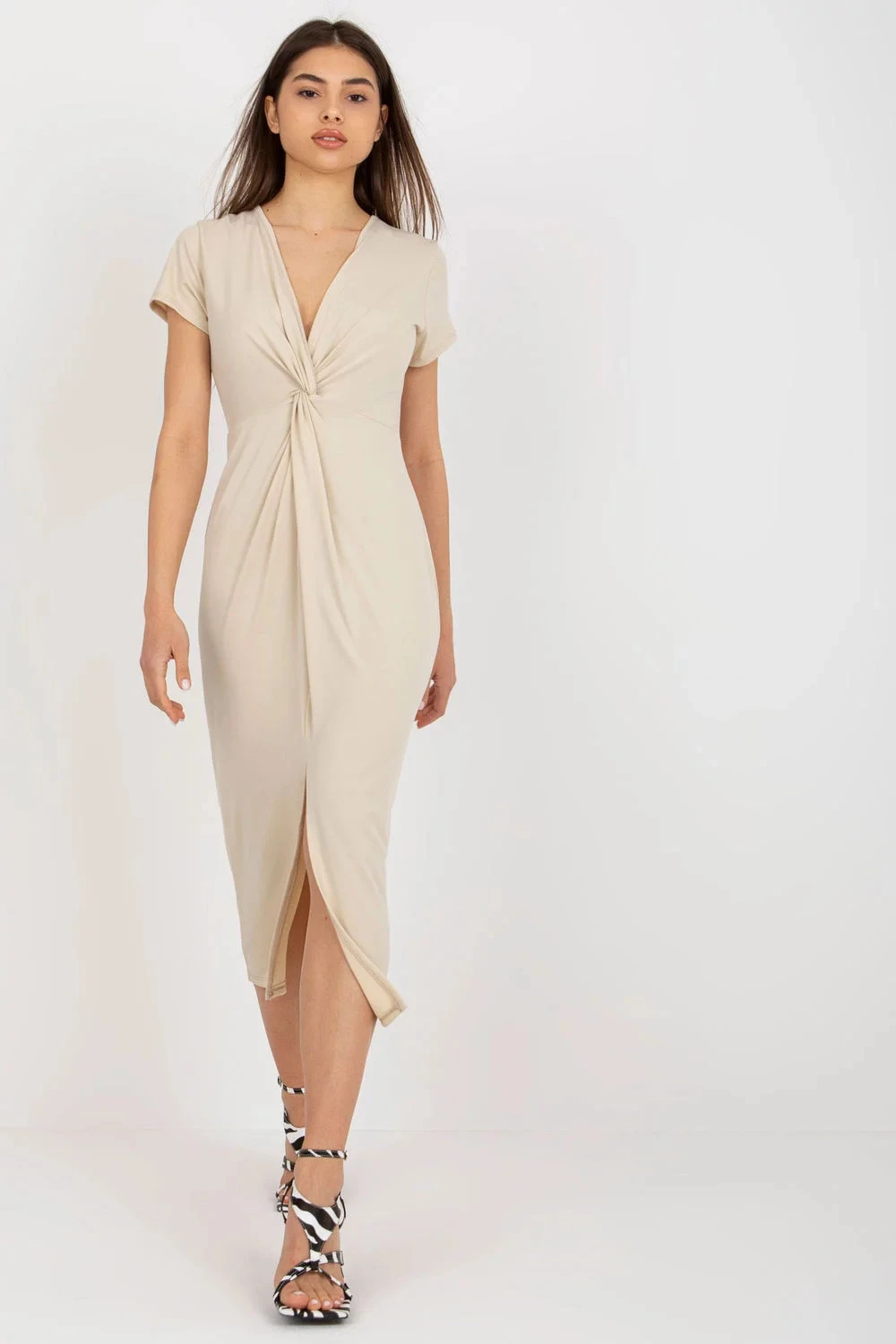 Šaty rovného střihu s krátkými rukávy a výstřihem do V. Ozdobné řasení na přední straně.