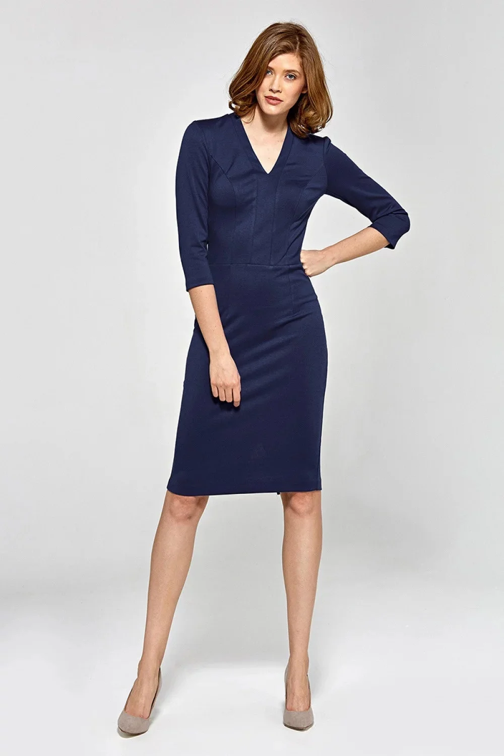 - šaty s dlouhými rukávy, výstřihem do V a přiléhavým střihem