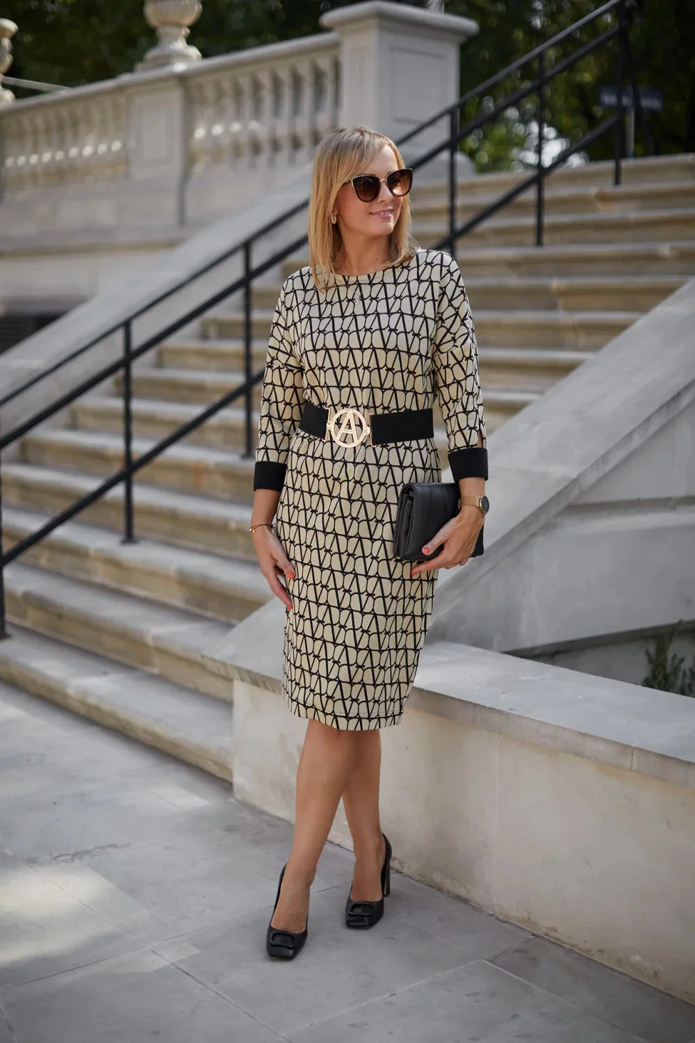 Velmi ženské a pohodlné šaty z žakárového úpletu s přídavkem elastanu. Navrženy v souladu se zásadami značky, tj. s ohledem na zralé ženy. Kimonový top se spadajícími rukávy, elastický pas s velkou ozdobnou sponou pro nastavení obvodu pasu, tlumené barvy a měkký a dobře ovladatelný úplet o hmotnosti cca 280 gm2. Díky tomu všemu jsou šaty ideální pro větší velikosti.