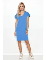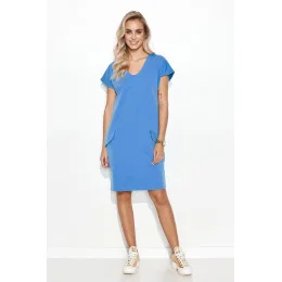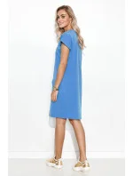 Mimořádně ženské šaty klasického business střihu. Šaty mají srdíčkový výstřih, který poskytuje prostor pro elegantní náhrdelník. Vpředu na bocích mají šaty dvě nakládané kapsy s klopami zdobenými zlatými knoflíky. Model je vyroben z příjemného teplákového úpletu. Délka pod kolena umožňuje odhalit tvarovaná lýtka. Šaty lehce sedí na bocích a zdůrazňují spodní část. Skvěle se hodí k lodičkám nebo klasickým jehlovým podpatkům. Strávíte v něm celý den a nebudete ho chtít sundat.