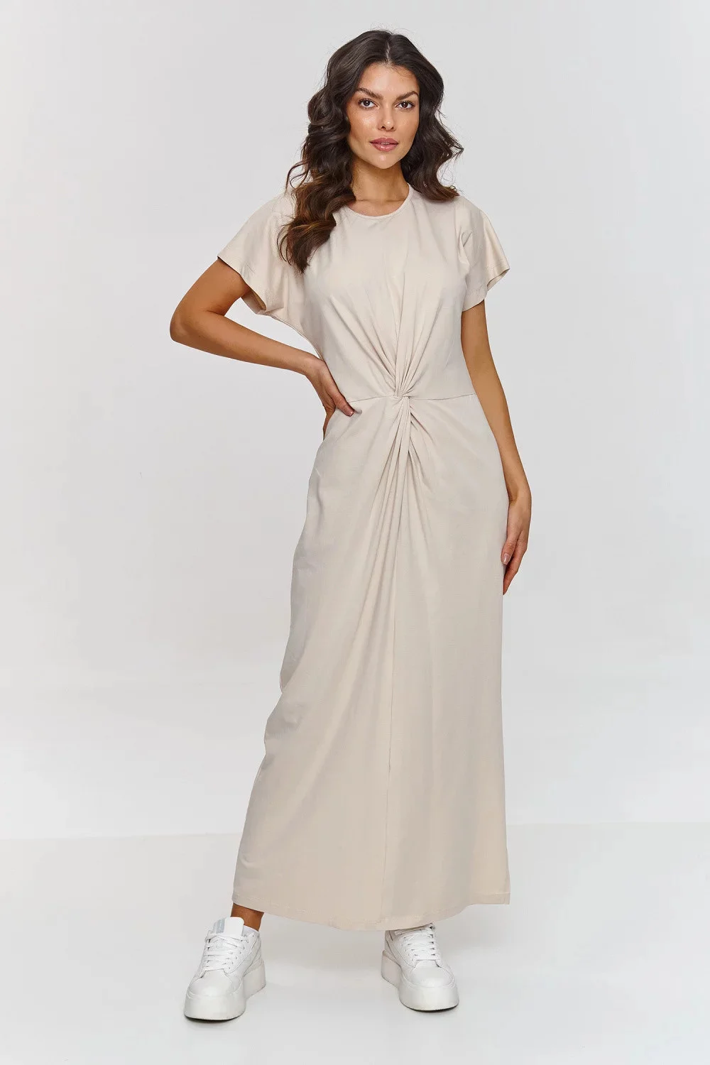 Tato maxi šaty jsou skvělou volbou pro ženy, které hledají spojení pohodlí a stylu. Model má jemné přeložení v pasu, které nejenže zdůrazňuje ženskou siluetu, ale také jí dodává efektní design. Díky tomu vypadá celkově souvisle a stylově. Boční rozříznutí jí dodává lehkost a smyslnost. Odkrýváním jemných nohou do stylizace vnáší dynamický prvek, zároveň umožňující větší volnost pohybu. Kulatý výstřih, krátký rukáv a maxi délka zdůrazňují univerzálnost celé kreace. Šaty jsou vyrobeny z lehkého, prodyšného bavlněného materiálu, ideálního na teplé dny. Díky tomu může kůže dýchat, poskytující vám pohodlí po celý den. Projekt spojuje v sobě minimalismus a eleganci. Díky jednoduchému střihu vypadají šaty svěže a moderně, skvěle se hodící jak do každodenních stylizací, tak na společenská setkání. Kreace skvěle ladí s bílými teniskami na každý den, stejně jako s elegantními sandály nebo lodičkami, vhodnými na večírky, výlety do města nebo letní procházky.