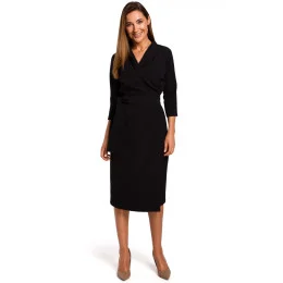 Šaty s obálkovým výstřihem a šálovým límcem, ženské a elegantní. Střih zdůrazněný úzkým páskem zeštíhluje postavu.
