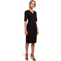 Jemné a elegantní tužkové šaty se zvýšenou linií pasu a výstřihem do V s průstřihy. Šaty s krátkými rukávy, zapínané na krytý zip. Šaty bez podšívky. Jemný kancelářský styl v té nejlepší podobě.