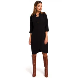 Elegantní šaty se střihem saka. Jedinečný střih se skrytým záhybem zapínaným vpředu na miniaturní patentky a vzadu na gumu. Vysoký límec, nárameníky a decentní knoflíky v jantarové barvě dodávají šatům noblesu. Šaty jsou bez podšívky.