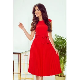 Plisované šaty s krátkými rukávy a páskem. Zapínání na zádech na krytý zip. Šaty v červené barvě. Značka numoco. Vyrobeno v Polsku.