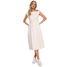 Pletené šaty v délce midi. Střih s vysokým pasem a volnou sukní opticky zužuje pas a díky rovnému střihu navíc zeštíhluje celou siluetu. Má charakteristické, velmi krátké rukávy a vestavěný výstřih. Šaty jsou ideální pro každodenní nošení i jako společenské šaty.