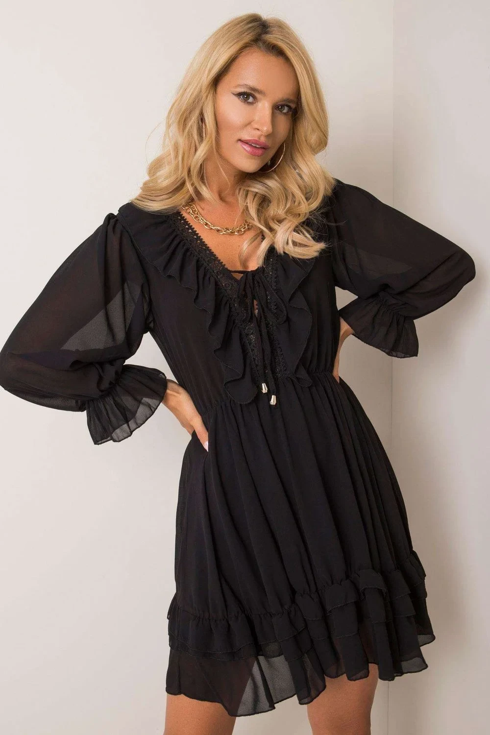 Šaty s dlouhými rukávy a podšívkou. Výstřih s volánky, krajkou a vázáním. Spodní část šatů je nařasená s volánky. Ideální pro mnoho příležitostí.