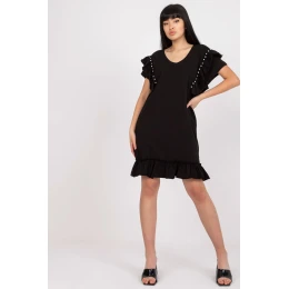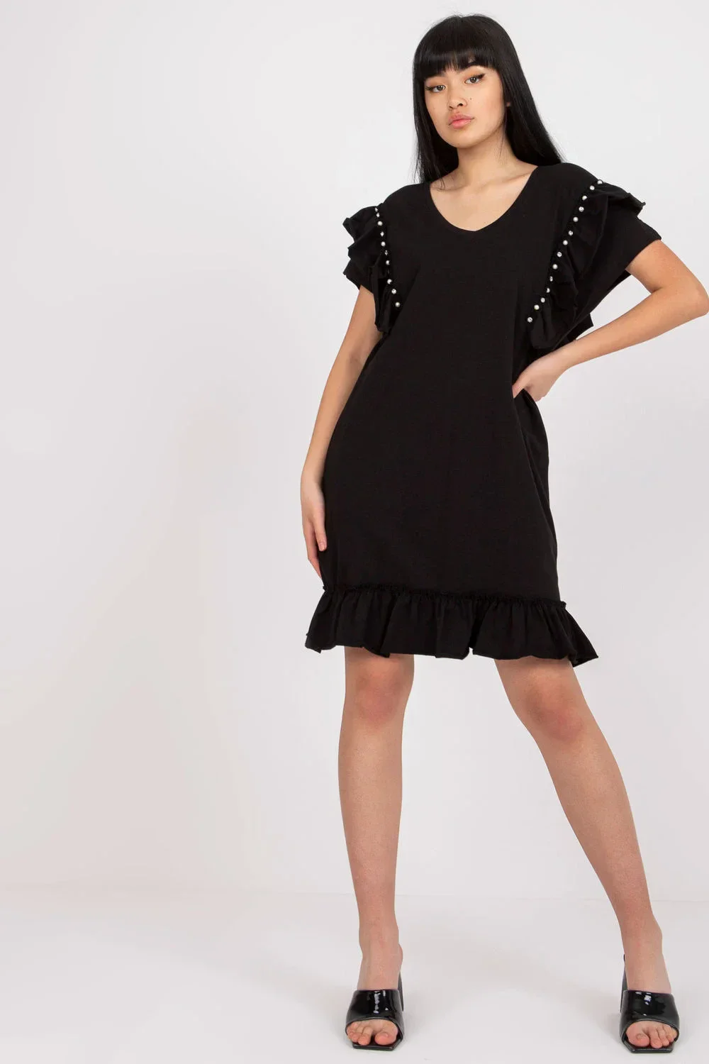 Šaty rovného střihu s krátkými rukávy. Šaty s volánky, zdobené zirkony. Ideální pro mnoho příležitostí.