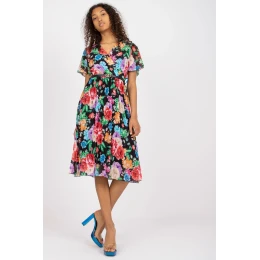Letní šaty z květované látky s rozšířeným střihem. Šaty s krátkými rukávy, obálkovým výstřihem a nařaseným lemem. Šaty mají podšívku a pásek.